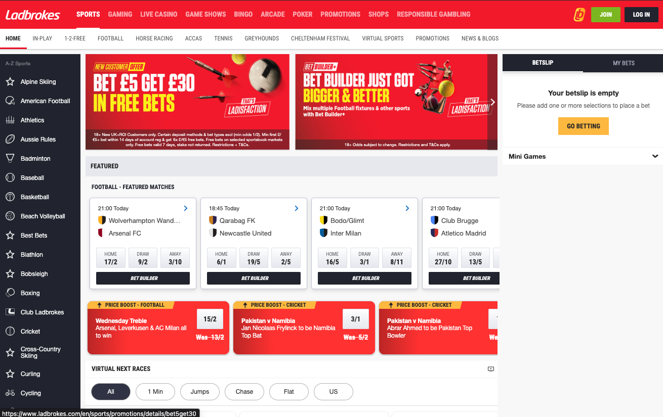 Get up to £20 in free bets when you sign up and place your first bet of £5! New customers can take advantage of a generous welcome offer that allows you to explore the extensive betting options available at Ladbrokes.